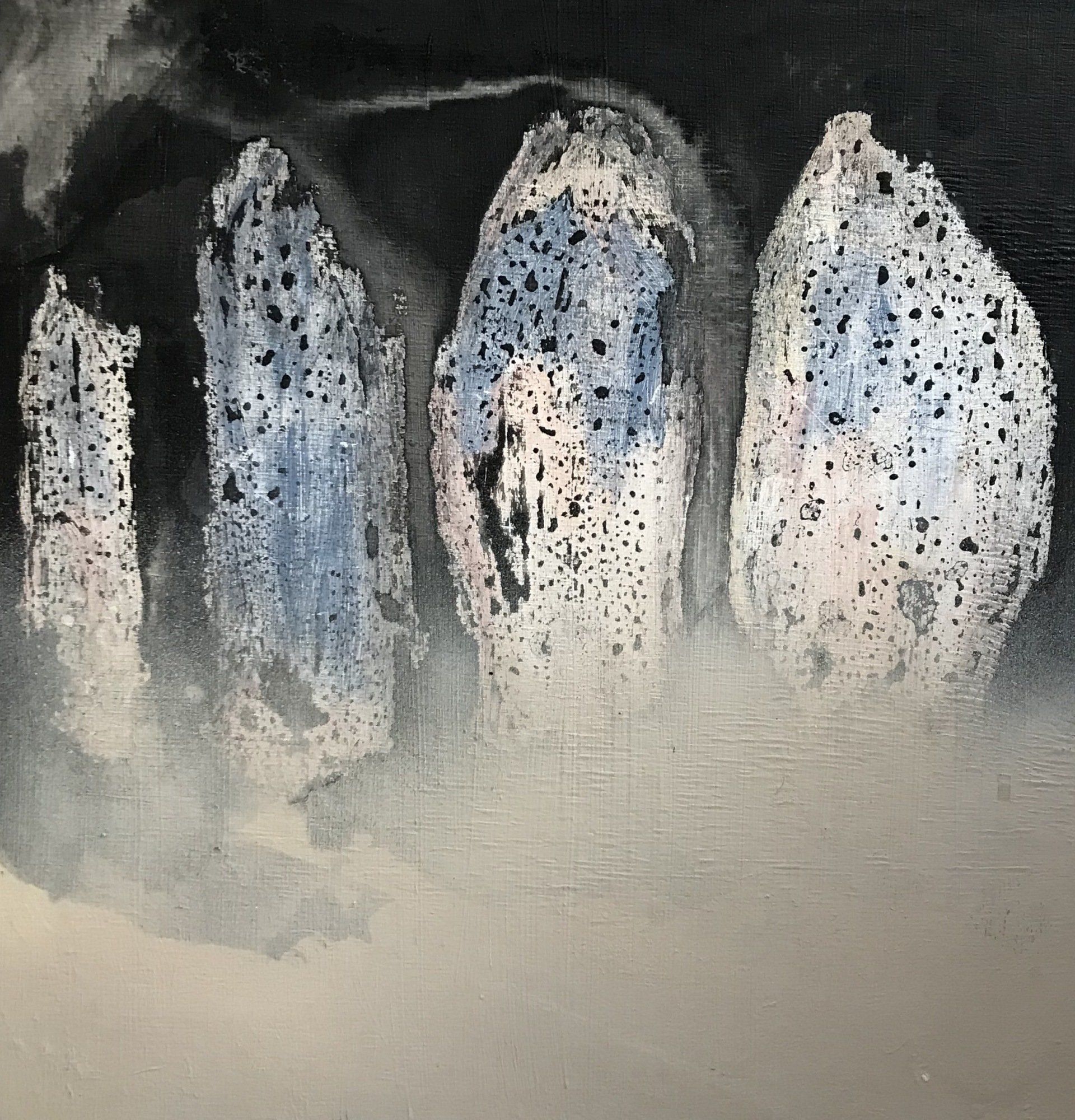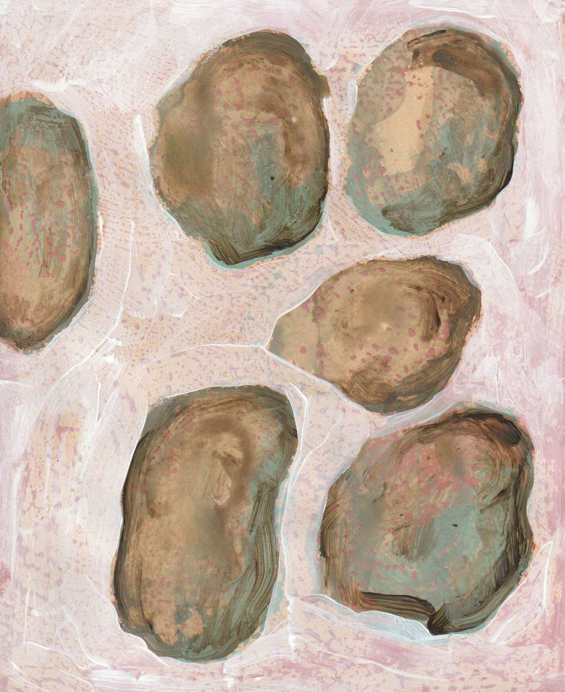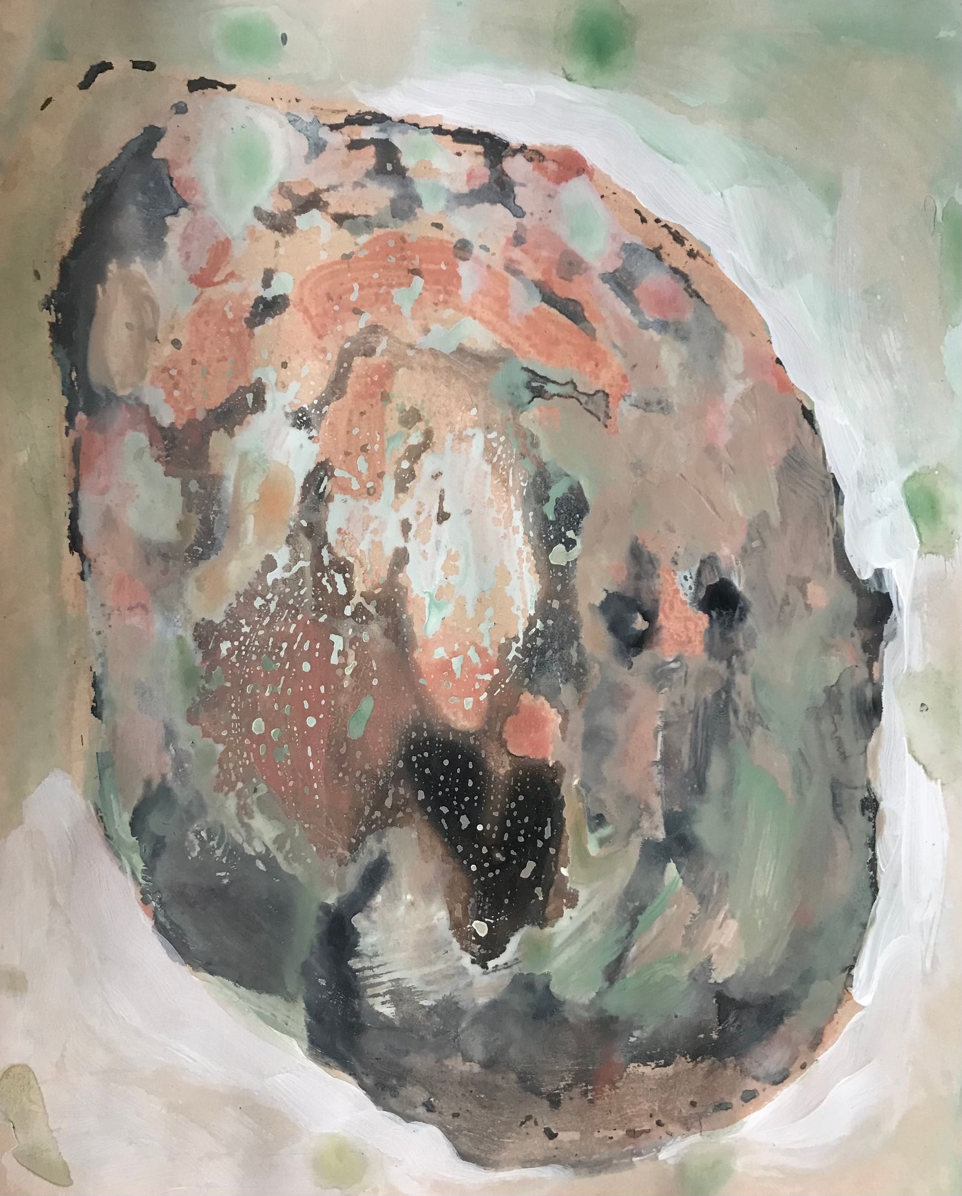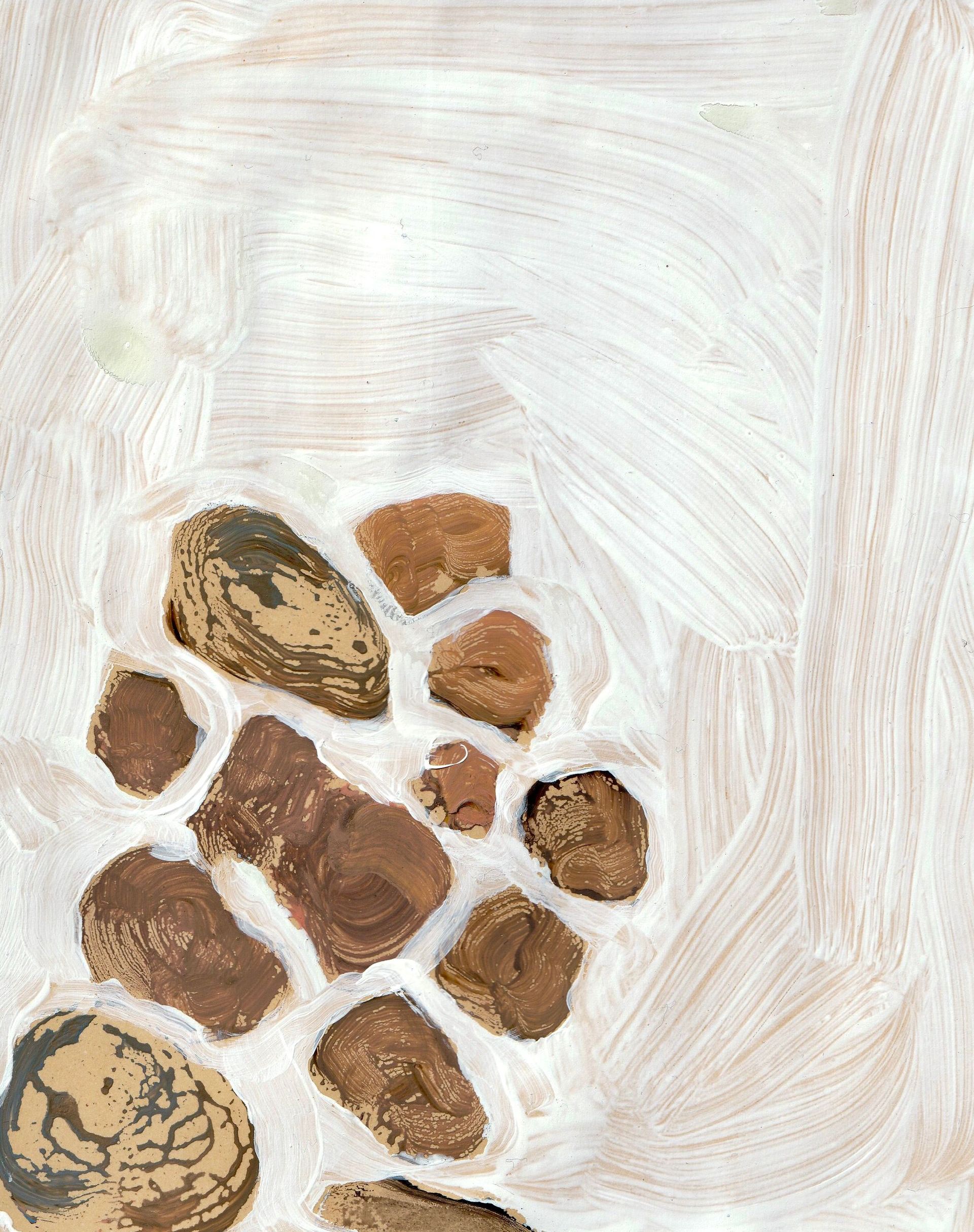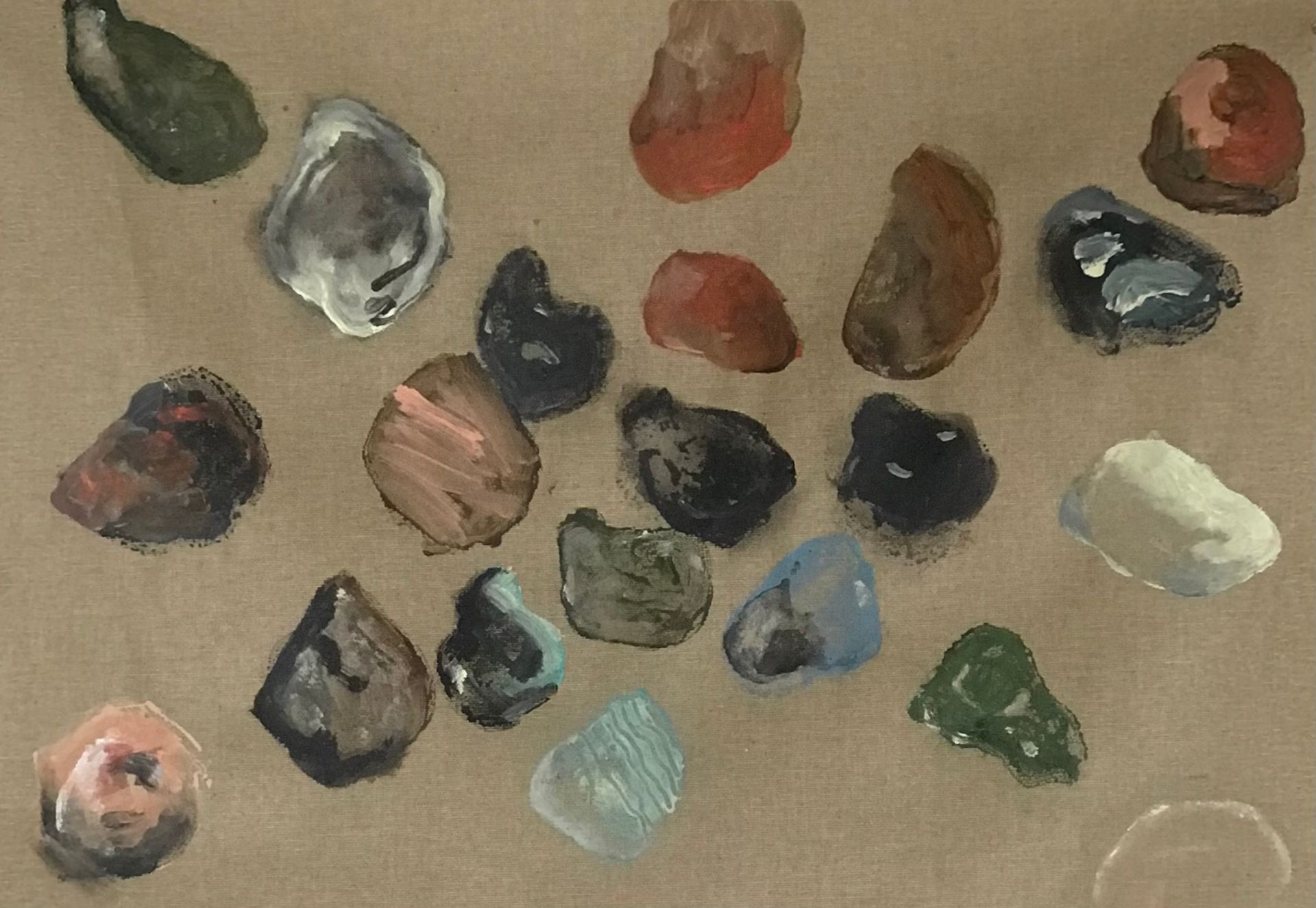 '...The hermetic nature of the stone is particularly fascinating. Each stone is in itself nothing other than itself. That provides something to hold on to that you can cherish and propagate. That's why you would think that the solidity of the stone would be recognizable in paintings and images that Lizzy makes of it. But nothing is less true.Her work radiates delicacy and vulnerability, the pebbles are multi-colored and have porous skin, just like her other works. Life and vulnerability shine through. She seems to want to contrast the unwavering character of what a rock stands for with security and empathy.'