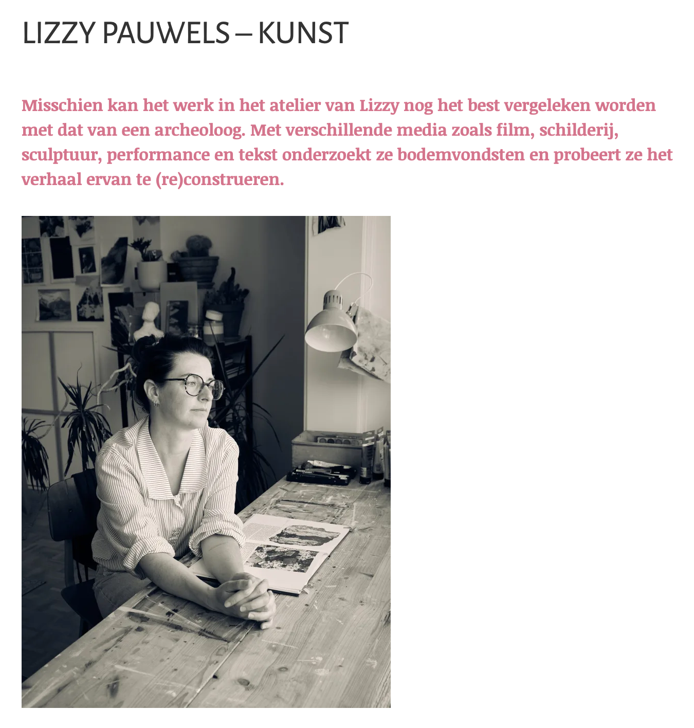 '...Time and again Lizzy introduces randomness and coincidence into her oeuvre. That is, without a doubt, the leitmotiv in the choices she makes, as an artist, and especially as a human being. She likes experimenting and the consequences that come with it, even if they are failures, because in her world and thinking, they are a crucial part of a learning process. (her commitment to art education is not just there, it fills an existential need).